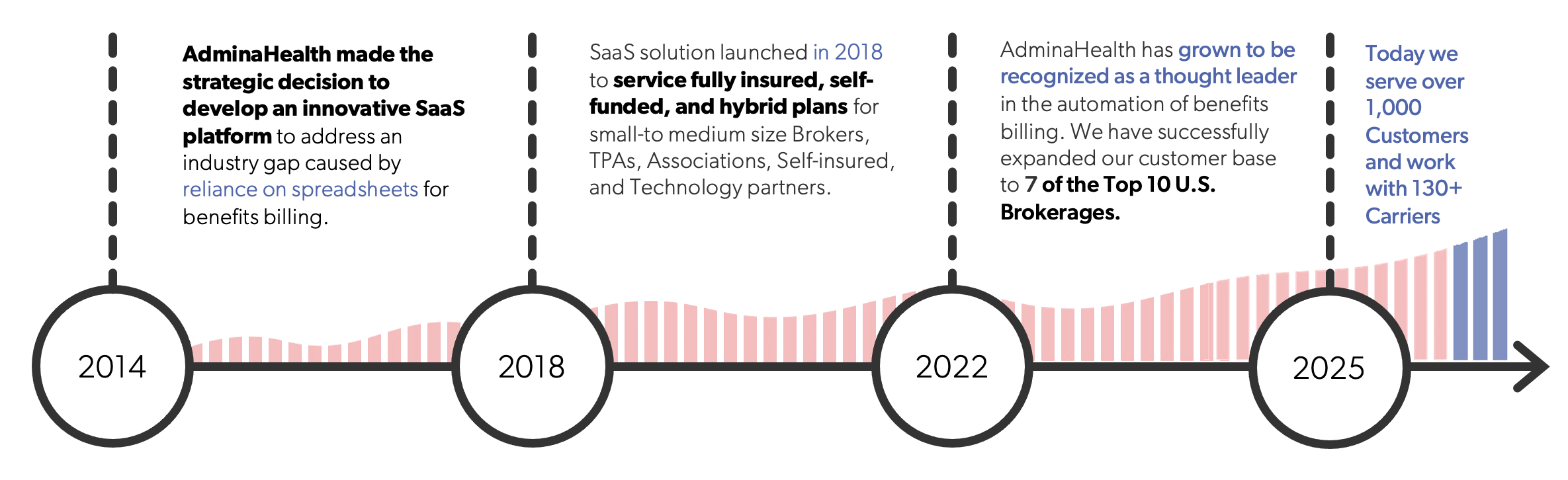 We were initially founded in 2014 as a risk-mitigating financial liquidity product under the name Salus Finance. The liquidity product gave more groups the ability to take advantage of the benefits of self-funding. However, we quickly realized that the standalone value of the capabilities of the platform that we developed could help businesses beyond just those transitioning to self-funding. We launched AdminaHealth in 2016 as a wholly owned subsidiary of Salus Finance, specifically focused on bringing these standalone software capabilities to market. In 2018, AdminaHealth relaunched the former software on an extremely flexible platform to support a scalable SaaS solution with enhanced capabilities to be able to service operations serving fully insured, self-funded and hybrid plans from any enrollment partner.